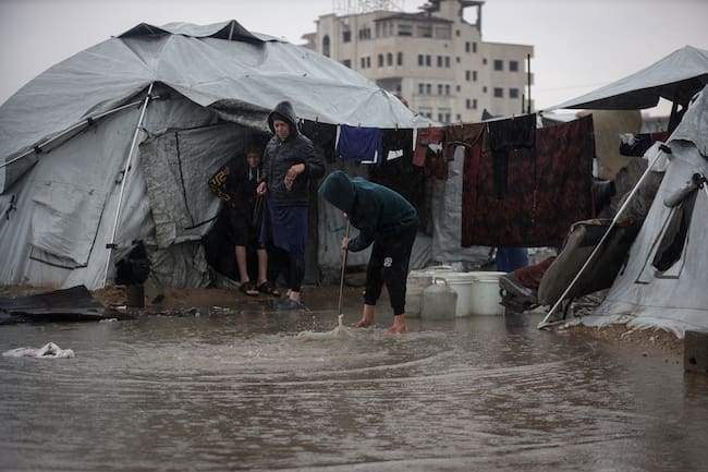Lluvias torrenciales inundan las carpas improvisadas de los palestinos en la Franja de Gaza. (Foto: Abdalhkem Abu Riash/Anadolu via Getty Images) / Anadolu