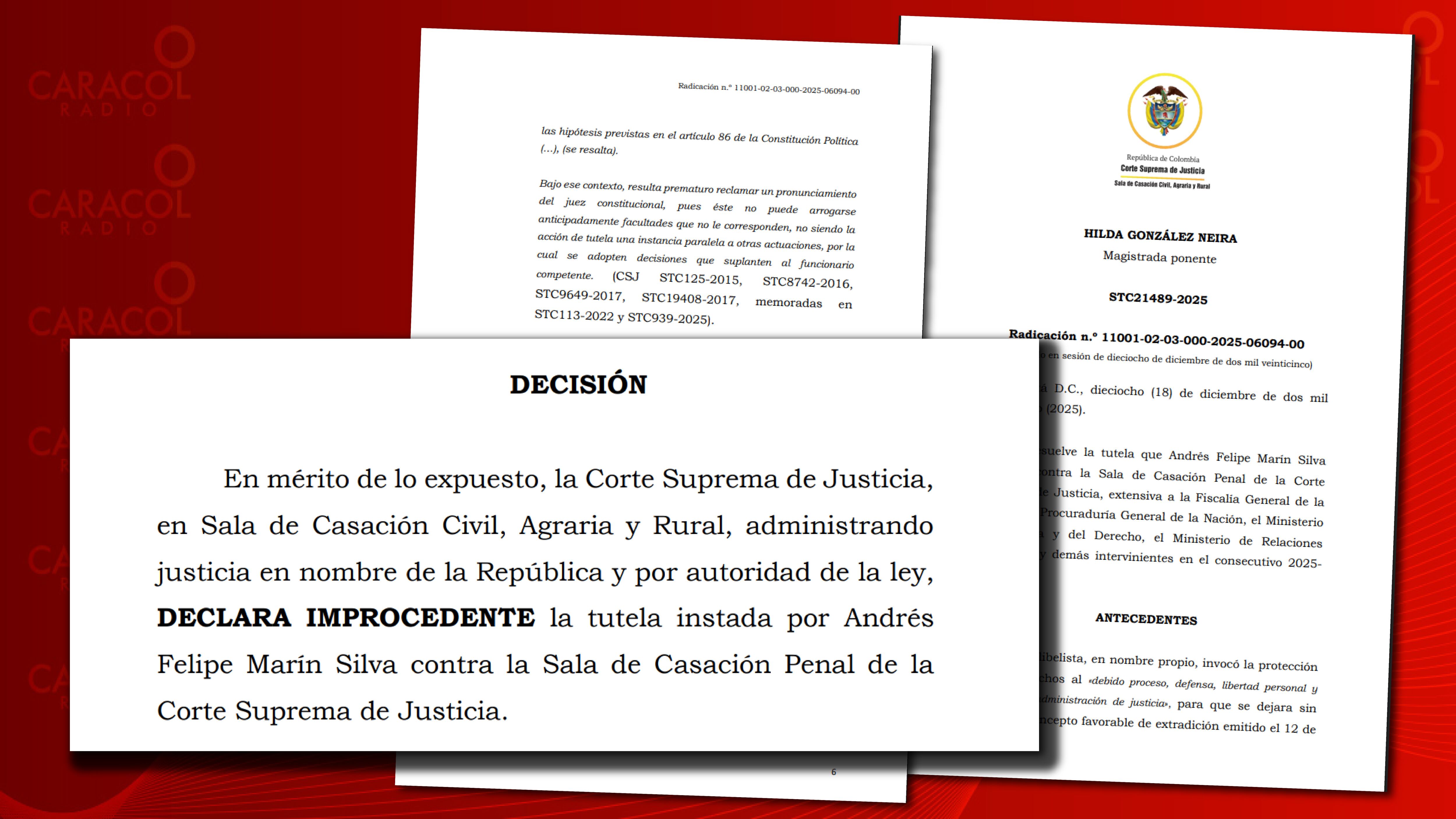 La magistrada Hilda González Neira, de la Sala de Casación Civil de la Corte Suprema de Justicia, declaró improcedente la tutela con la que el jefe criminal Andrés Felipe Marín Silva, alias ‘Pipe Tuluá’, pretendía frenar su extradición hacia Estados Unidos por narcotráfico.