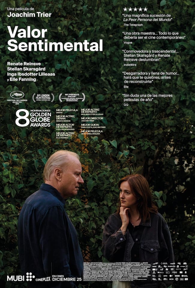 Tras su exitoso paso por el Festival de Cannes 2025, donde obtuvo el Gran Premio del Jurado, desde el 25 de diciembre está en salas de cine la sensible cinta “Valor Sentimental” (Sentimental Value), dirigida por Joachim Trier, es reconocida por su sensibilidad narrativa y su profundidad emocional, captado la atención de la crítica y de la industria internacional.