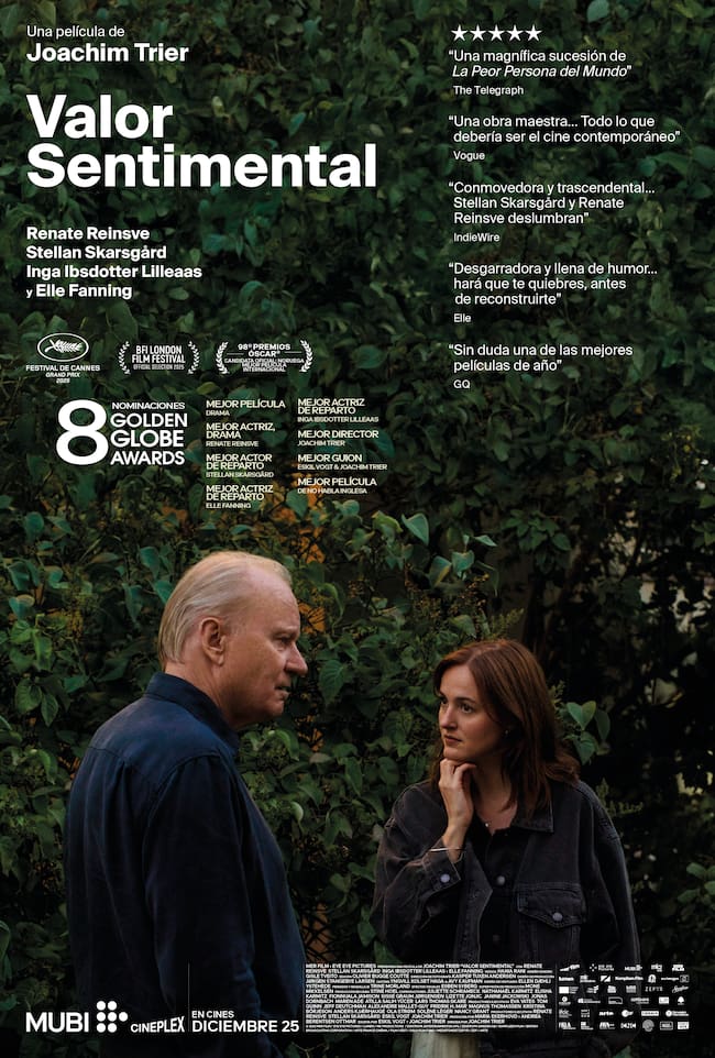 “Valor Sentimental” fue presentada en el Festival Internacional de Cine de Bogotá (BIFF) y cuenta con ocho nominaciones a los Golden Globe, incluyendo Mejor Película de Drama y Mejor Película de Habla No Inglesa. Además, hace parte del shortlist a Mejor Película Internacional de los Premios de la Academia® 2026. El largometraje está disponible desde el 25 de diciembre, en salas de cine de todo el país, distribuida por Cineplex.