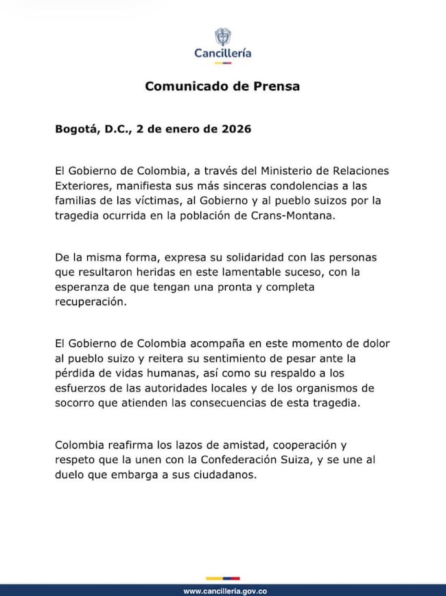 El Gobierno de Colombia se unió al duelo mundial y expresó sus condolencias ante la tragedia en un bar de Crans-Montana.