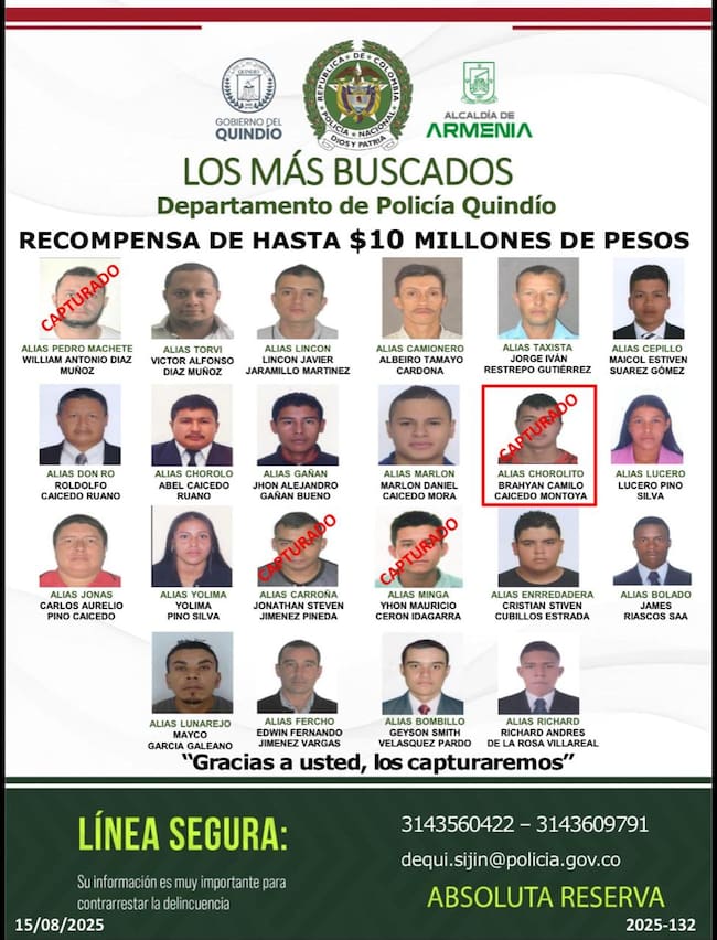 Ya son cuatro los capturados dentro del cartel que estableció la Policía, Quindío dentro de los delincuentes más buscados del departamento.