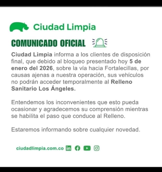 La empresa Ciudad Limpia informó que, debido al bloqueo presentado este lunes 5 de enero de 2026 en la vía hacia Fortalecillas, sus camiones no han podido acceder de manera temporal al sitio de disposición final, por causas ajenas a su operación.