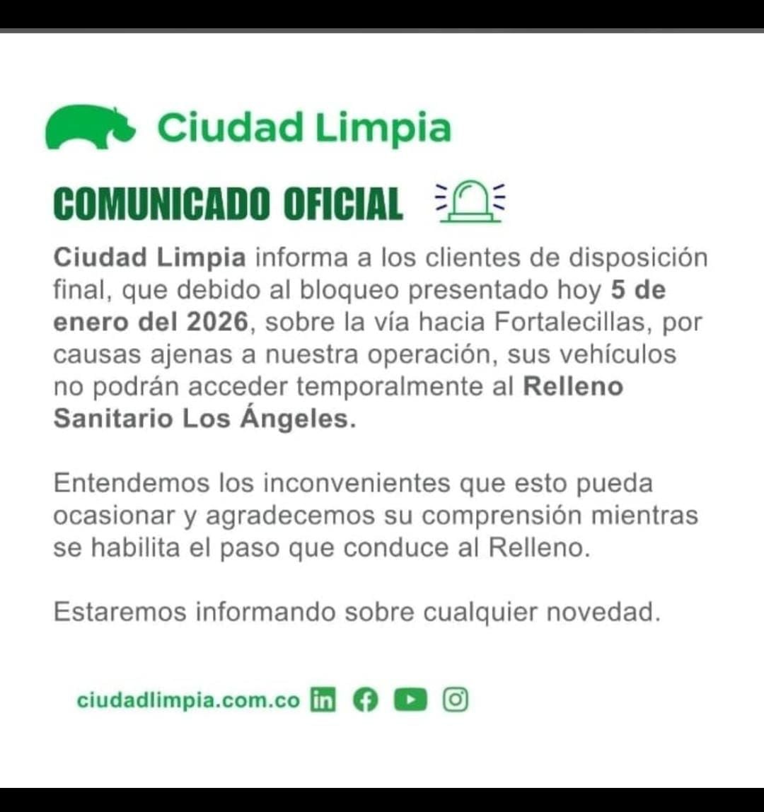 La empresa Ciudad Limpia informó que, debido al bloqueo presentado este lunes 5 de enero de 2026 en la vía hacia Fortalecillas, sus camiones no han podido acceder de manera temporal al sitio de disposición final, por causas ajenas a su operación.