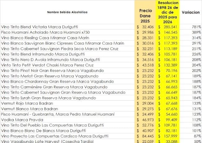 El DANE es la entidad seleccionada por el Gobierno para certificar los precios, siendo los encargados de determinar qué referencias de vino incrementan y en qué porcentajes, según muestra el cuadro.
