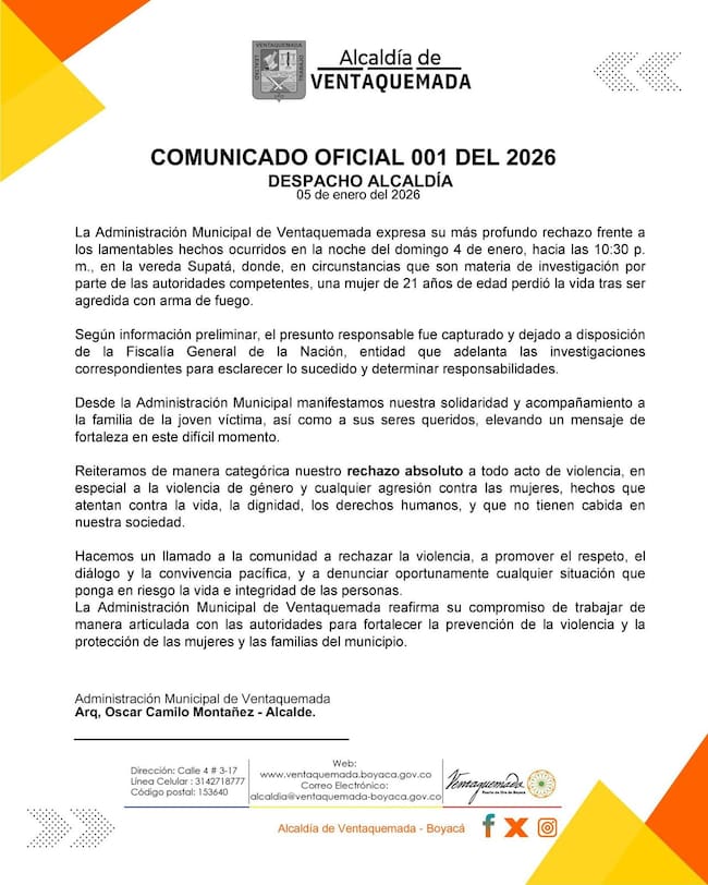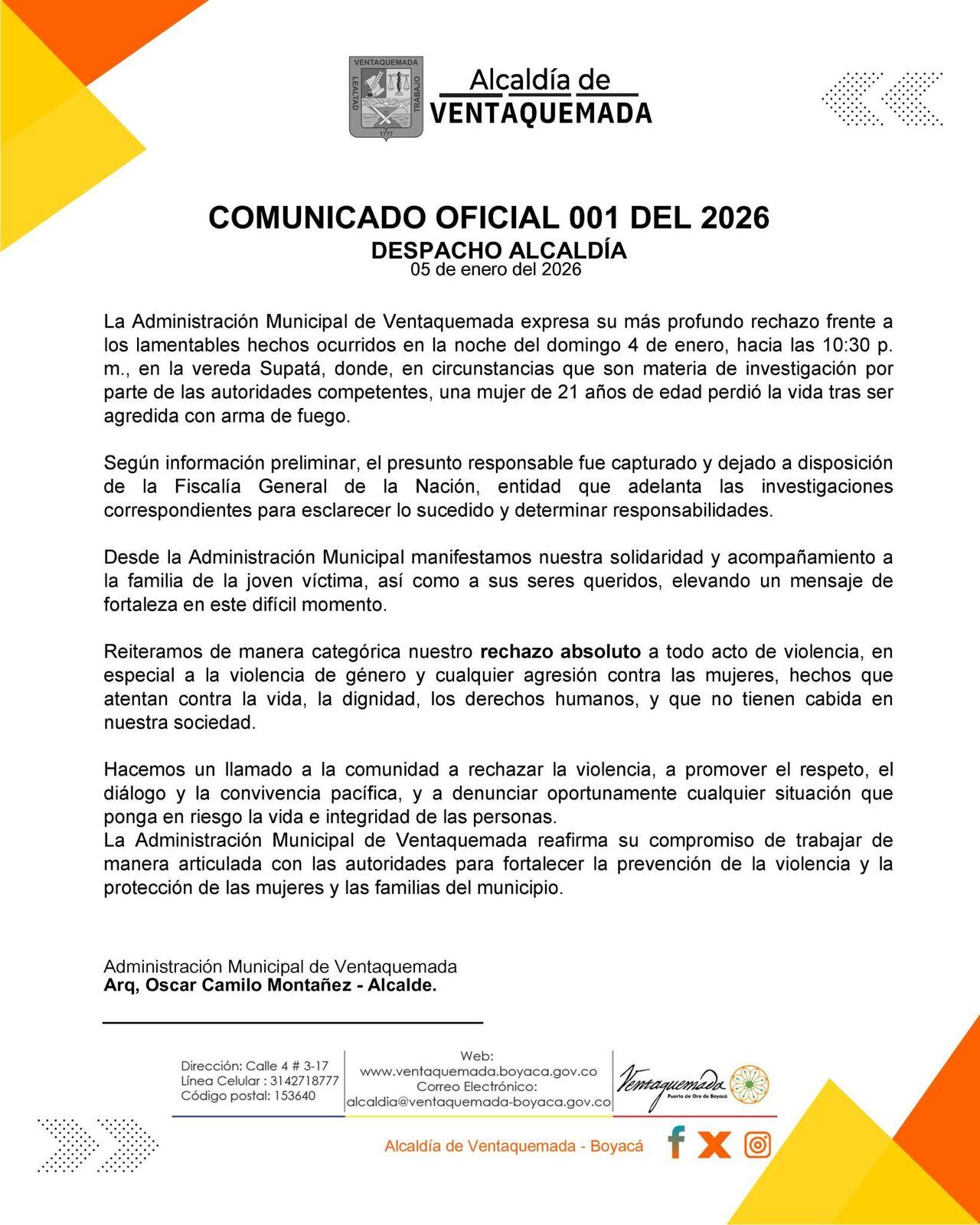 La Alcaldía de Ventaquemada a través de un comunicado oficial, expresó su más profundo rechazo frente al homicidio de una mujer de 21 años, ocurrido en la noche del domingo 4 de enero en la vereda Supatá, un hecho que es materia de investigación por parte de las autoridades competentes.