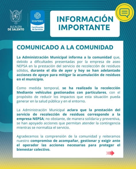 A través de redes sociales la alcaldía de Salento comunicó que debido a la falta de recolección implemento plan de contingencia con camiones del municipio y privados para poder adelantar el proceso de recolección.