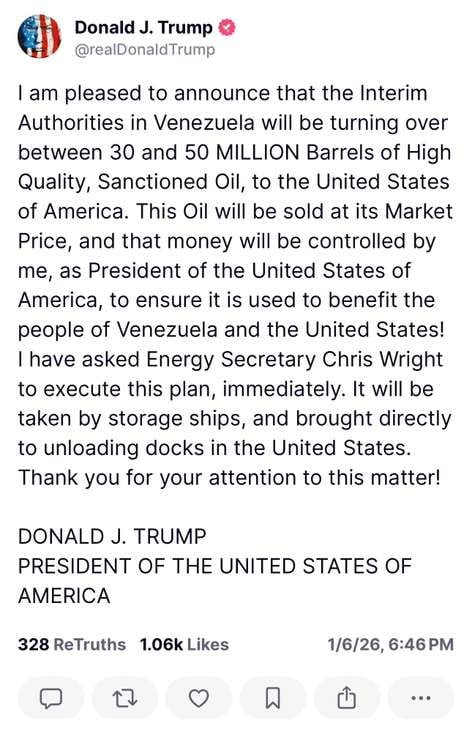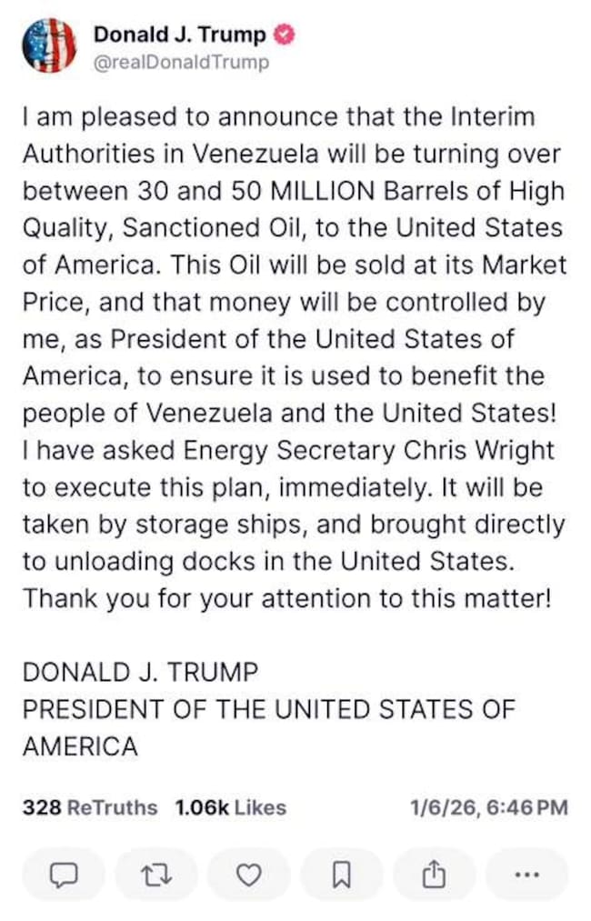 El presidente de Estados Unidos, Donald Trump, puso un mensaje en su cuenta de Truth en el que dice “Me complace anunciar que las autoridades interinas de Venezuela entregarán a Estados Unidos entre 30 y 50 millones de barriles de petróleo sancionado de alta calidad. Ese petróleo se venderá a su precio de mercado y el dinero será controlado por mí como presidente de Estados Unidos para garantizar que se utilice para beneficiar al pueblo de Venezuela y los Estados Unidos de América”.