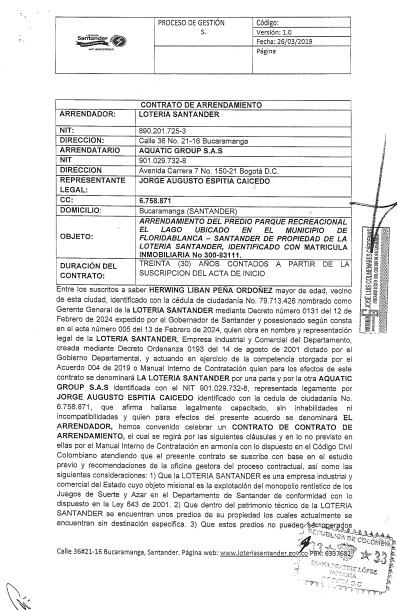 La Lotería Santander suscribió un contrato de arrendamiento por 30 años con la empresa Aquatic Group S.A.S. para la recuperación, adecuación y operación del Parque Recreacional El Lago, ubicado en el municipio de Floridablanca.