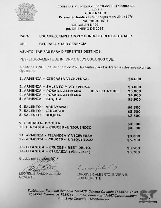 La Cooperativa Integral de Transportadores de Circasia (COOTRACIR) anunció las nuevas tarifas para los diferentes destinos intermunicipales del departamento, un ajuste que ha generado inquietud entre los usuarios por el impacto en el bolsillo. Según explicó el gerente de la cooperativa, Leonel Giraldo, el aumento responde a la aplicación de una estructura de costos exigida por el Ministerio de Transporte y la Superintendencia de Transporte, entidades que regulan este tipo de servicios.