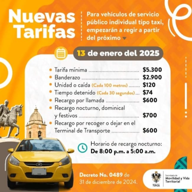 En la cuidad de Tunja, la carrera mínima se fijó e $5.800 COP, acompañado de un costo inicial de $2.900 COP. Es importante tener en cuenta que el recargo nocturno es de 8:00 p.m. a 5:00 a.m.