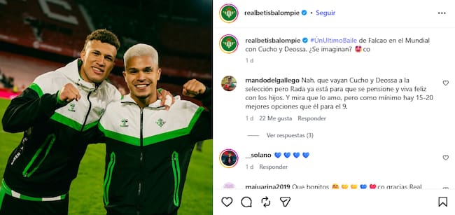 Así quedó evidenciado en redes sociales con una foto de los dos jugadores béticos y el mensaje: “#ÚnUltimoBaile de Falcao en el Mundial con Cucho y Deossa. ¿Se imaginan?”.