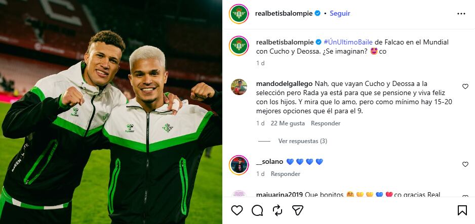 Así quedó evidenciado en redes sociales con una foto de los dos jugadores béticos y el mensaje: “#ÚnUltimoBaile de Falcao en el Mundial con Cucho y Deossa. ¿Se imaginan?”.