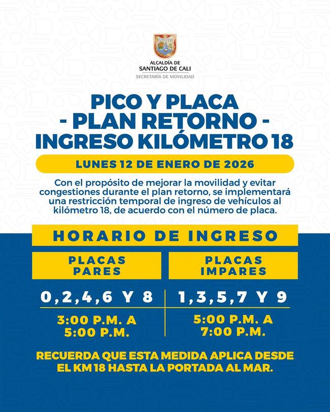 Con el objetivo de mejorar la movilidad y evitar congestiones durante el plan retorno, la secretaría de Movilidad de Cali anunció la implementación de pico y placa en el sector del kilómetro 18, vía al mar, para este lunes festivo 12 de enero.