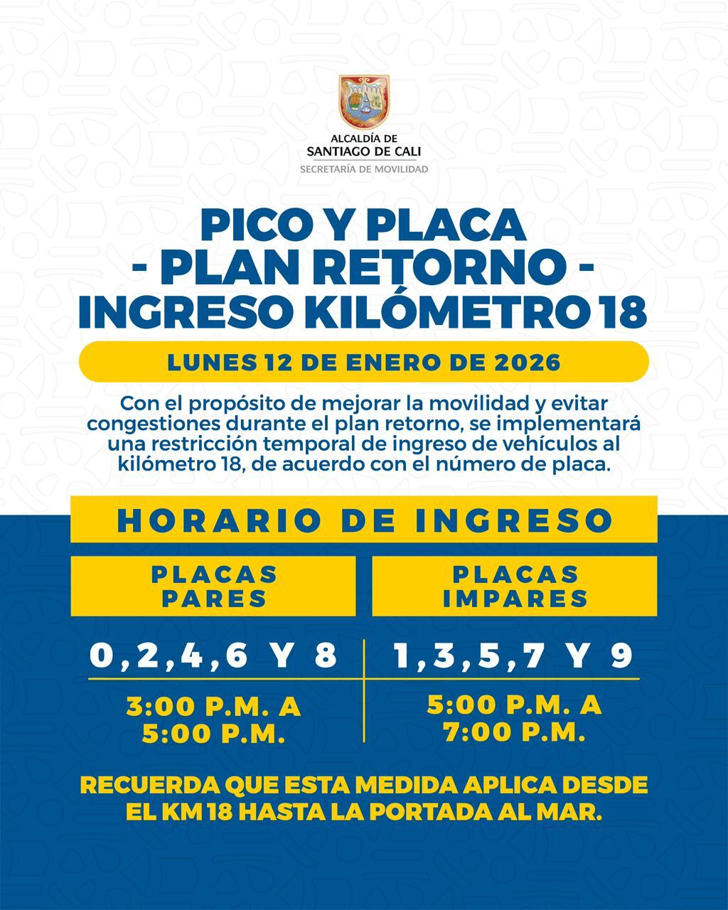 Con el objetivo de mejorar la movilidad y evitar congestiones durante el plan retorno, la secretaría de Movilidad de Cali anunció la implementación de pico y placa en el sector del kilómetro 18, vía al mar, para este lunes festivo 12 de enero.