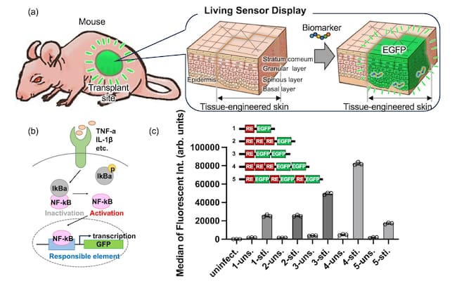 La piel modificada se injertó en ratones a los que se les causó inflamación. El sistema funcionó y la piel modificada injertada emitió la fluorescencia verde, permitiendo que las señales moleculares internas se conviertan en una señal óptica externa.
