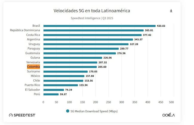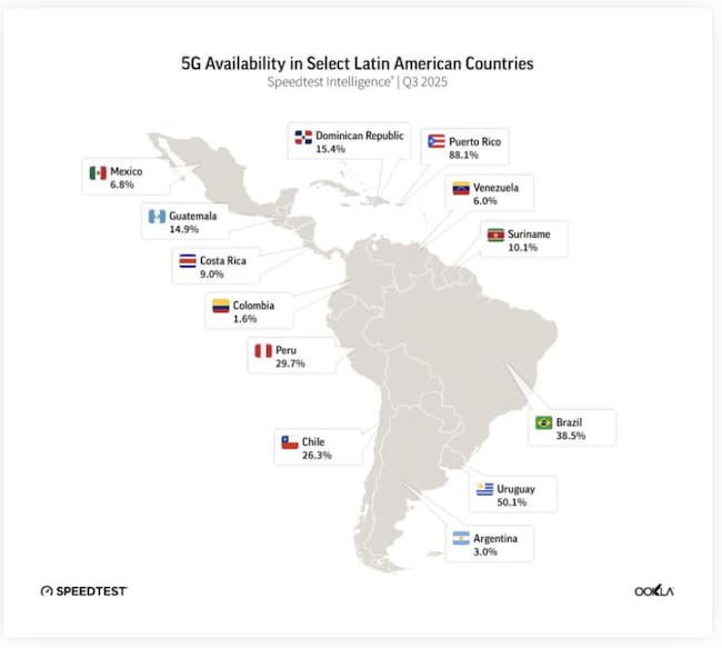 De acuerdo con Speedtest Intelligence, la unidad de análisis de Ookla, Puerto Rico (88,1 %) y Uruguay (50,1 %) lideraron la disponibilidad de 5G en la región, entendida como el porcentaje de usuarios que permanecieron conectados a este tipo de red la mayor parte del tiempo. Brasil (38,5 %), Perú (29,7 %) y Chile (26,3 %) registraron niveles intermedios, mientras que varios países se ubicaron por debajo del 15%.