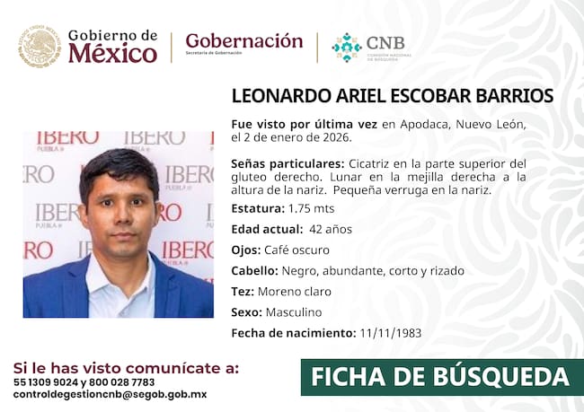 La Universidad Iberoamericana en Puebla (México) denunció que un miembro de su equipo docente, el colombiano Leonardo Ariel Escobar Barrios, está desaparecido desde el 2 de enero cuando regresó al país tras pasar las fiestas de fin de año en Colombia.