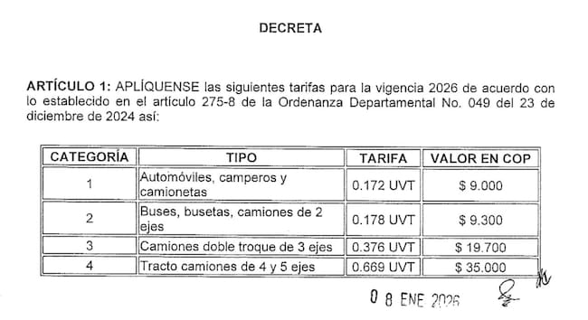 El ajuste quedó establecido mediante decreto para la vigencia 2026, conforme a la actualización de la Unidad de Valor Tributario (UVT) y la normatividad departamental vigente.