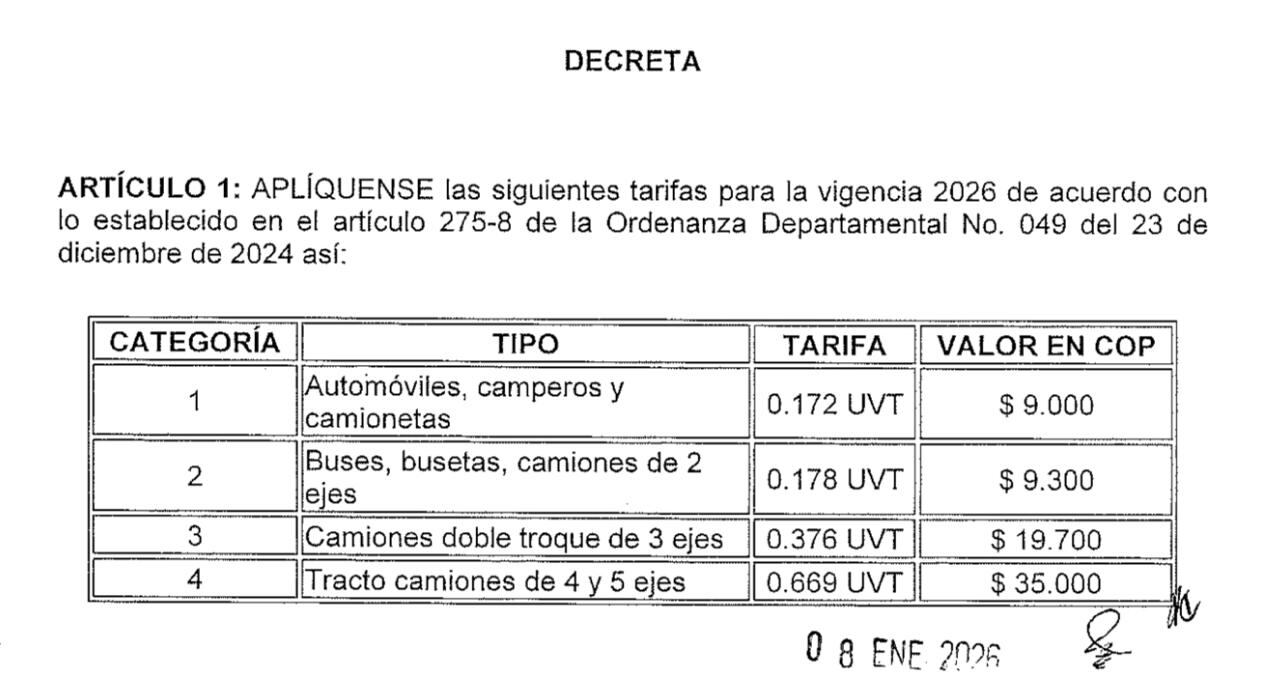 El ajuste quedó establecido mediante decreto para la vigencia 2026, conforme a la actualización de la Unidad de Valor Tributario (UVT) y la normatividad departamental vigente.