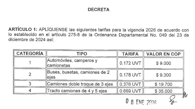 La Secretaría de Infraestructura de Santander confirmó los nuevos valores que ya rigen para las diferentes categorías de vehículos.