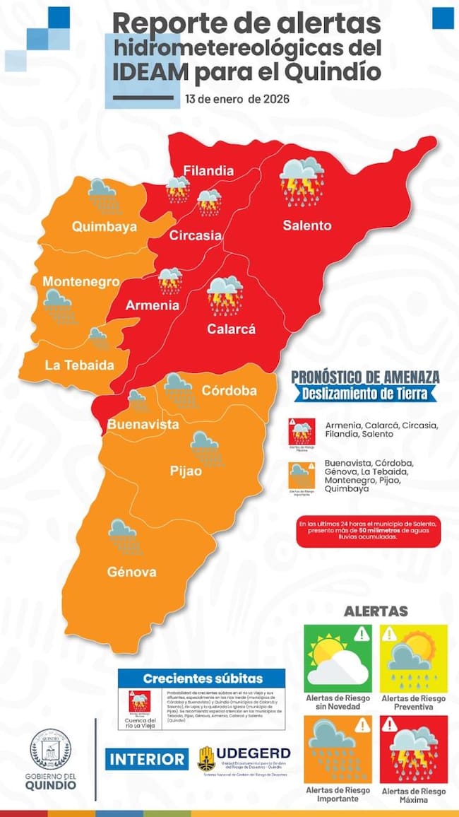 En alerta roja se encuentran Armenia, Calarcá, Circasia, Filandia y Salento, mientras que en alerta naranja están Buenavista, Córdoba, Génova, La Tebaida, Montenegro, Pijao y Quimbaya. El informe también señala riesgo de crecientes súbitas en la cuenca del río La Vieja, especialmente en los municipios de Córdoba, Buenavista y Quimbaya, así como en sectores de Calarcá y Pijao. En el caso de Salento, se reportan más de 50 milímetros de lluvias acumuladas en las últimas 24 horas.