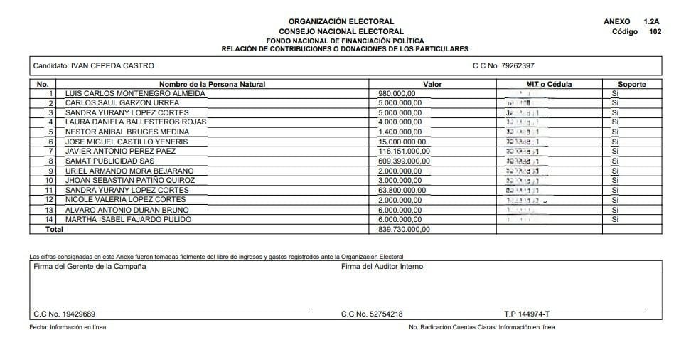 Así las cosas, Cepeda reportó que del total de 964 millones de pesos, $125 millones provinieron de recursos propios y 839 millones fueron registrados con el código 102, que corresponde a contribuciones, donaciones o créditos en dinero o especie que realicen los particulares.