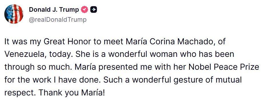 Machado es “una mujer extraordinaria que ha pasado por muchísimo”, reaccionó horas después Trump en su plataforma Truth Social.