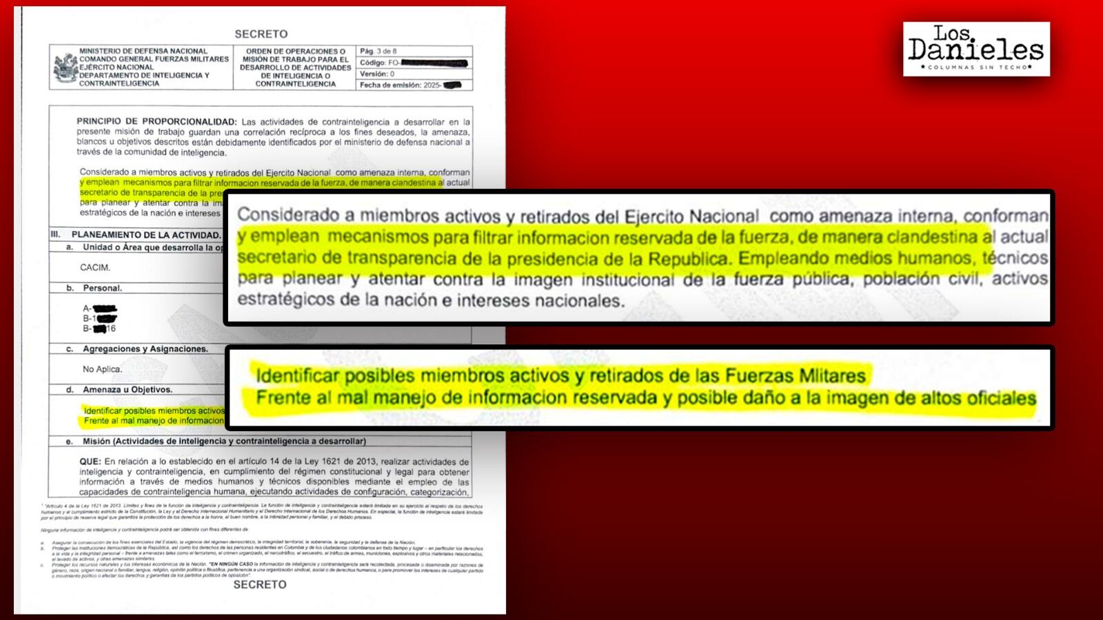 El comunicado dice además que el documento presentado por Idárraga como una orden del Comando de Apoyo de Combate de Contrainteligencia Militar, CACIM, para identificar a sus fuentes de información es falso y que sus características no corresponden a una misión de trabajo.