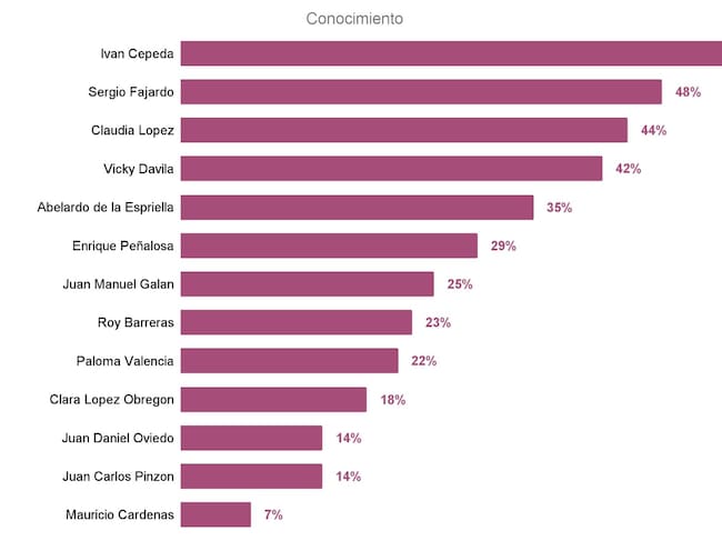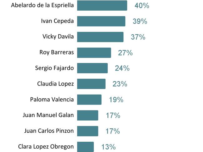 Ante la pregunta: Si las elecciones a la Presidencia de la República fueran mañana, ¿por qué candidato a la Presidencia votaría? Los candidatos Iván Cepeda con el 30% y Abelardo de la Espriella con el 22% encabezan la encuesta; les sigue Paloma Valencia con 3% y Juan Manuel Galán con 2%.