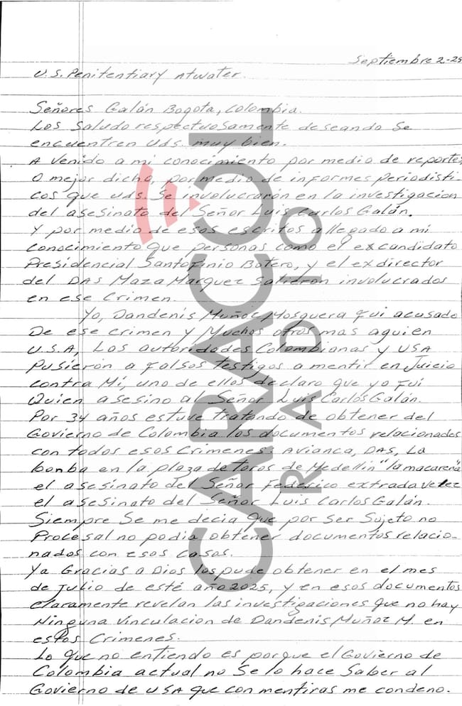 Desde una cárcel federal de máxima seguridad en Estados Unidos, Dandenis Muñoz Mosquera, alias ‘La Quica’, envió una carta manuscrita y fechada el 2 de septiembre de 2025 a la familia Galán. En el documento, conocido ahora en exclusiva por Caracol Radio, el exsicario del cartel de Medellín niega haber participado en el asesinato de Luis Carlos Galán Sarmiento y solicita a sus hijos una declaración juramentada sobre lo que conocen de su presunta vinculación con el magnicidio ocurrido en agosto de 1989.