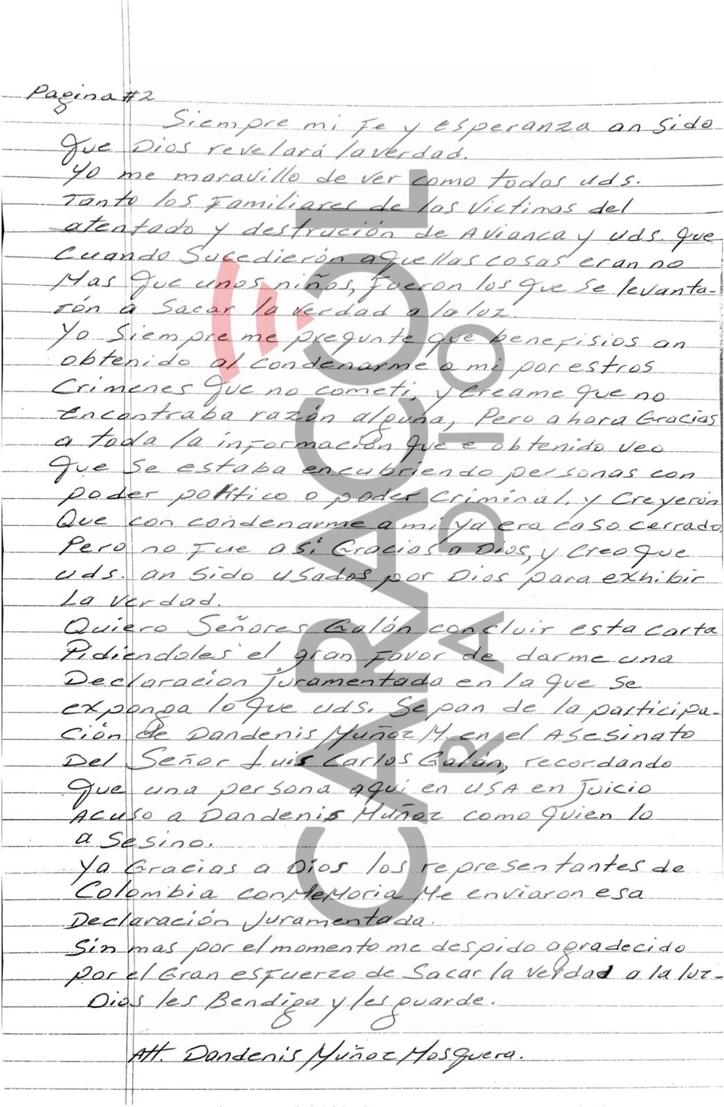 “Yo, Dandenis Muñoz Mosquera, fui acusado de ese crimen y muchos otros más aquí en Estados Unidos. Las autoridades colombianas y americanas pusieron a falsos testigos a mentir en juicio contra mí; uno de ellos declaró que yo fui quien asesinó al señor Luis Carlos Galán”.