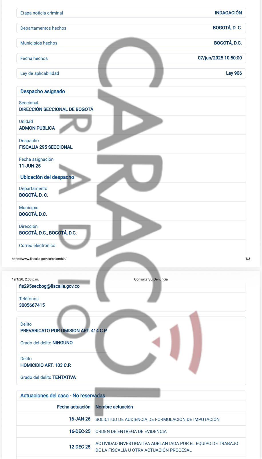 Caracol Radio también conoció que el pasado 16 de enero, un fiscal de Administración Pública de la Seccional de Bogotá radicó la solicitud de imputación contra Rodríguez.