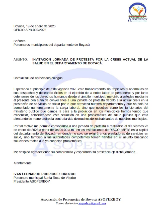 La agudización de la crisis en la prestación de los servicios de salud en Boyacá llevó a los personeros municipales del departamento a convocar una jornada de protesta para exigir soluciones urgentes. Así lo confirmó Iván Leonardo Rodríguez Orozco, personero de Santa Rosa de Viterbo y presidente de la Asociación de Personeros de Boyacá (ASOPERBOY), en exclusiva para Caracol Radio.