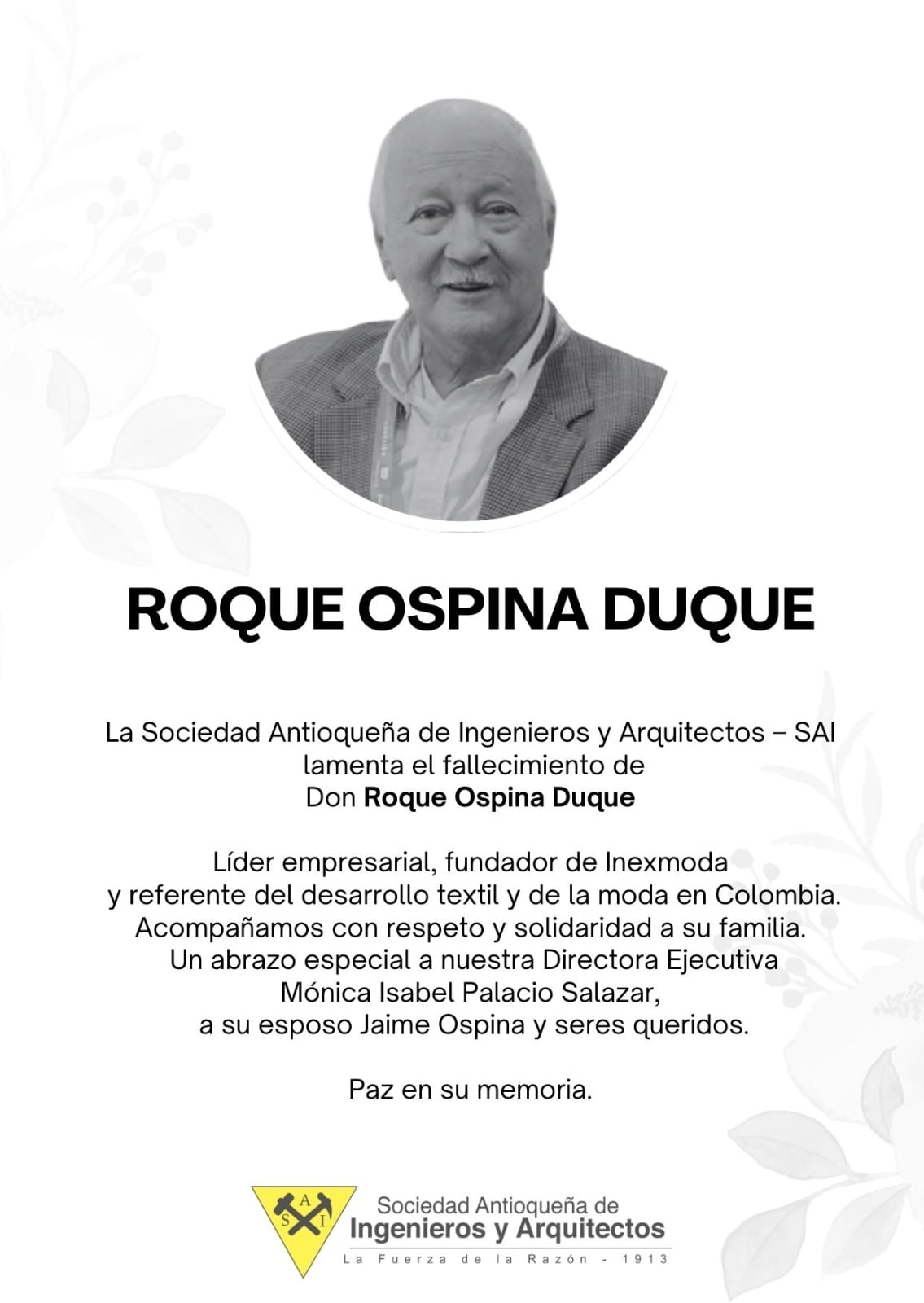 Desde la SAI, la entidad expresó su pesar por el fallecimiento y resaltó el legado que deja para Colombia. La organización envió además un mensaje de solidaridad a la familia del empresario y, de manera especial, a su Directora Ejecutiva, Mónica Isabel Palacio Salazar, así como a su esposo Jaime, a sus hijos y a sus familiares, reiterando su acompañamiento en este momento.