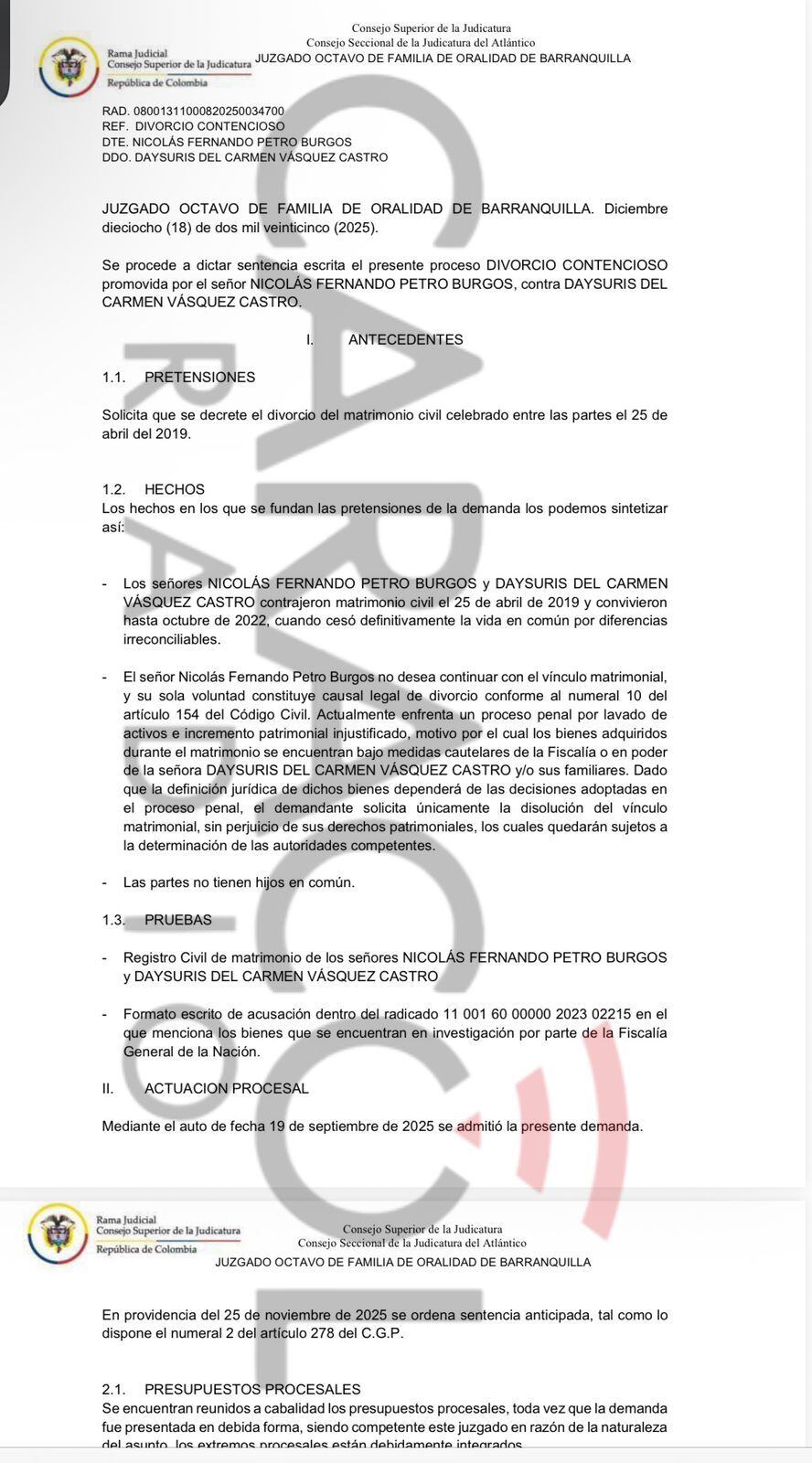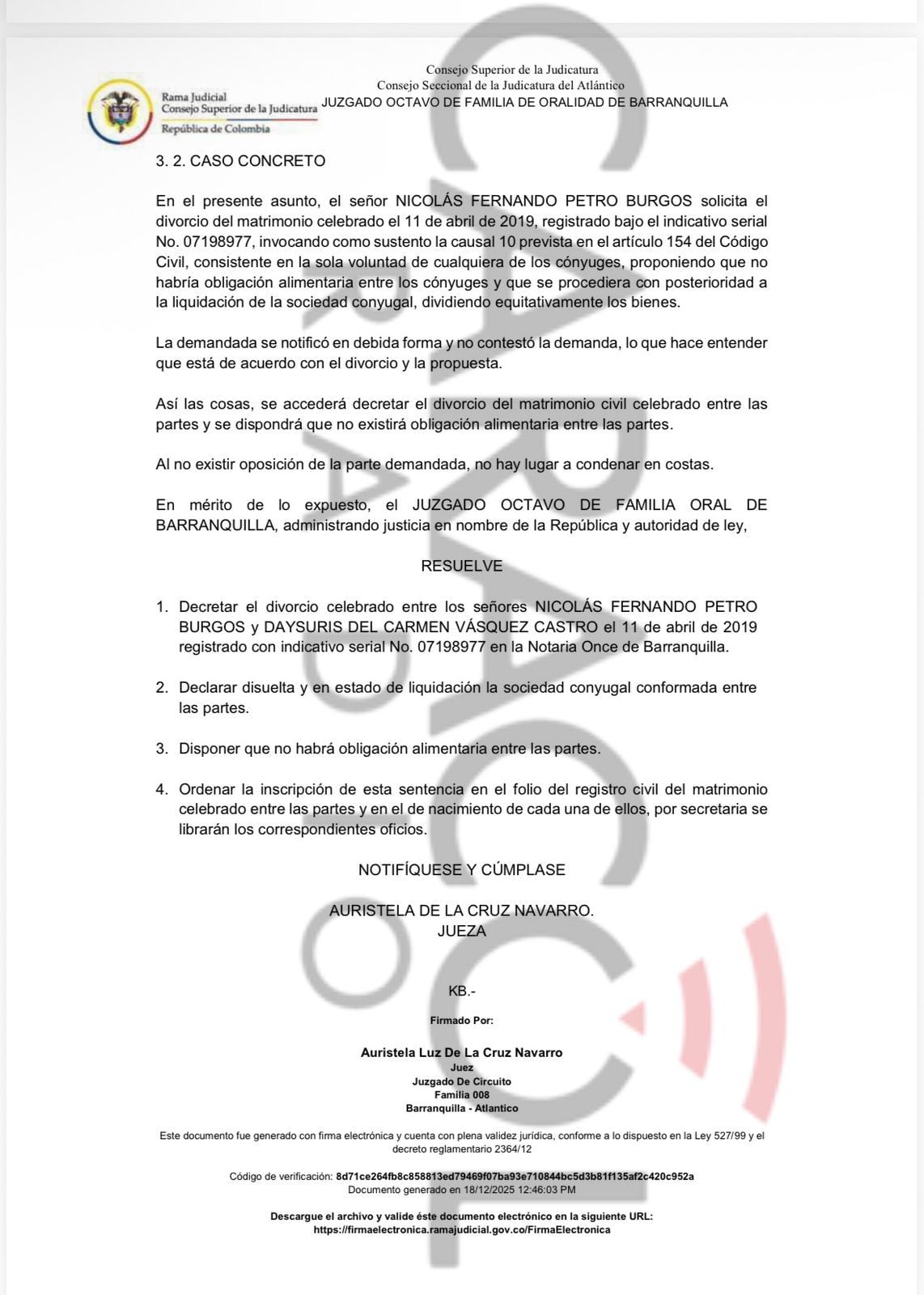 “Decretar el divorcio celebrado entre los señores NICOLÁS FERNANDO PETRO BURGOS y DAYSURIS DEL CARMEN VÁSQUEZ CASTRO el 11 de abril de 2019, registrado con indicativo serial No. 07198977 en la Notaría Once de Barranquilla”, se lee en la decisión judicial conocida por Caracol Radio.