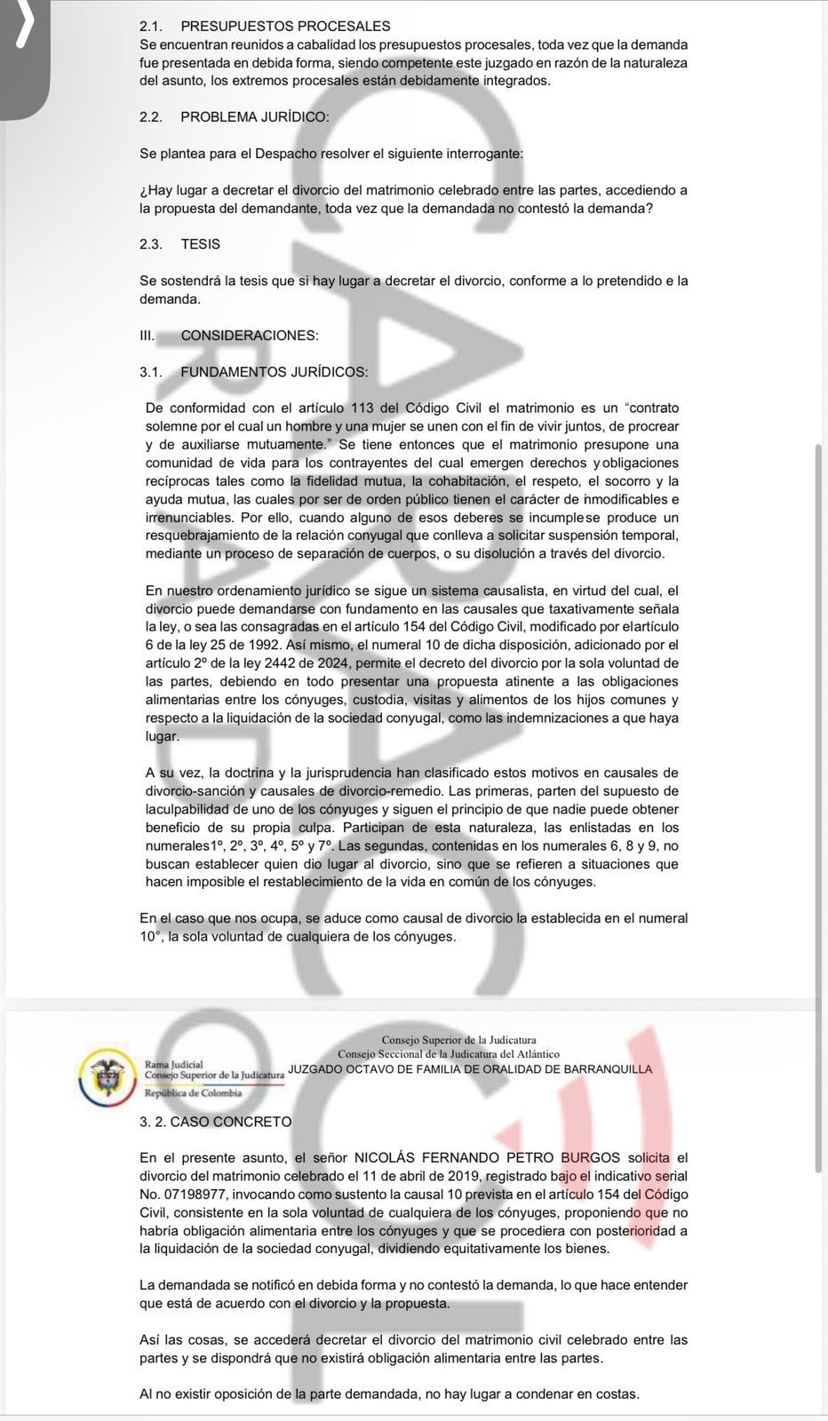 En la decisión del juez también se señaló que “el señor Nicolás Fernando Petro Burgos no desea continuar con el vínculo matrimonial, y su sola voluntad constituye causal legal de divorcio conforme al numeral 10 del artículo 154 del Código Civil”.