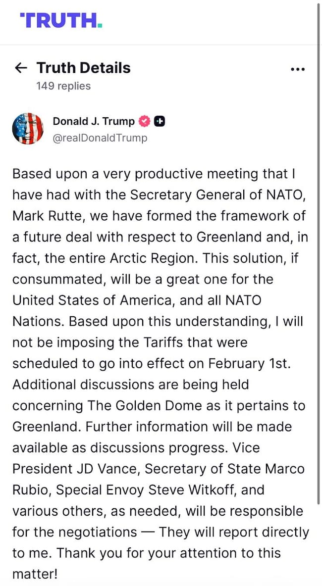 Trump anunció un acuerdo sobre Groenlandia con la OTAN y retiró amenaza de aranceles