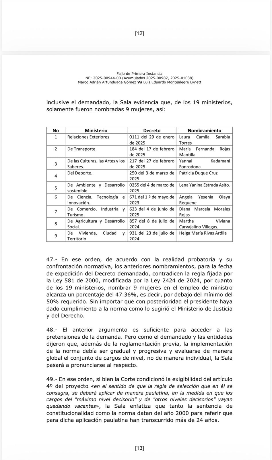 La Sala de Decisión en una decisión de primera instancia determinó que, con el decreto que nombró a Montealegre en el cargo, no se cumplió con la cuota mínima femenina que establece la ley.