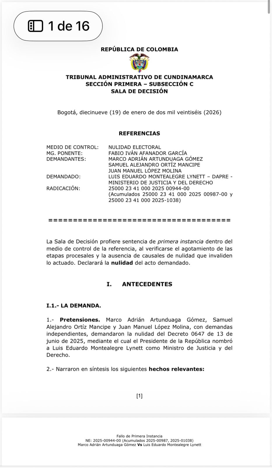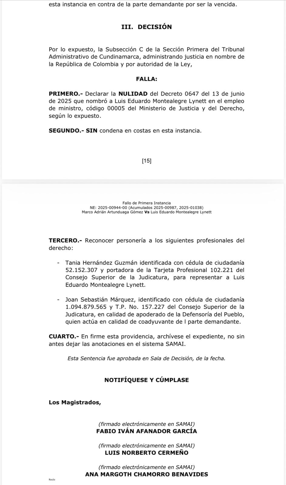 Primera foto del fallo del Tribunal Administrativo de Cundinamarca que anuló nombramiento de Eduardo Montealegre como ministro de Justicia.