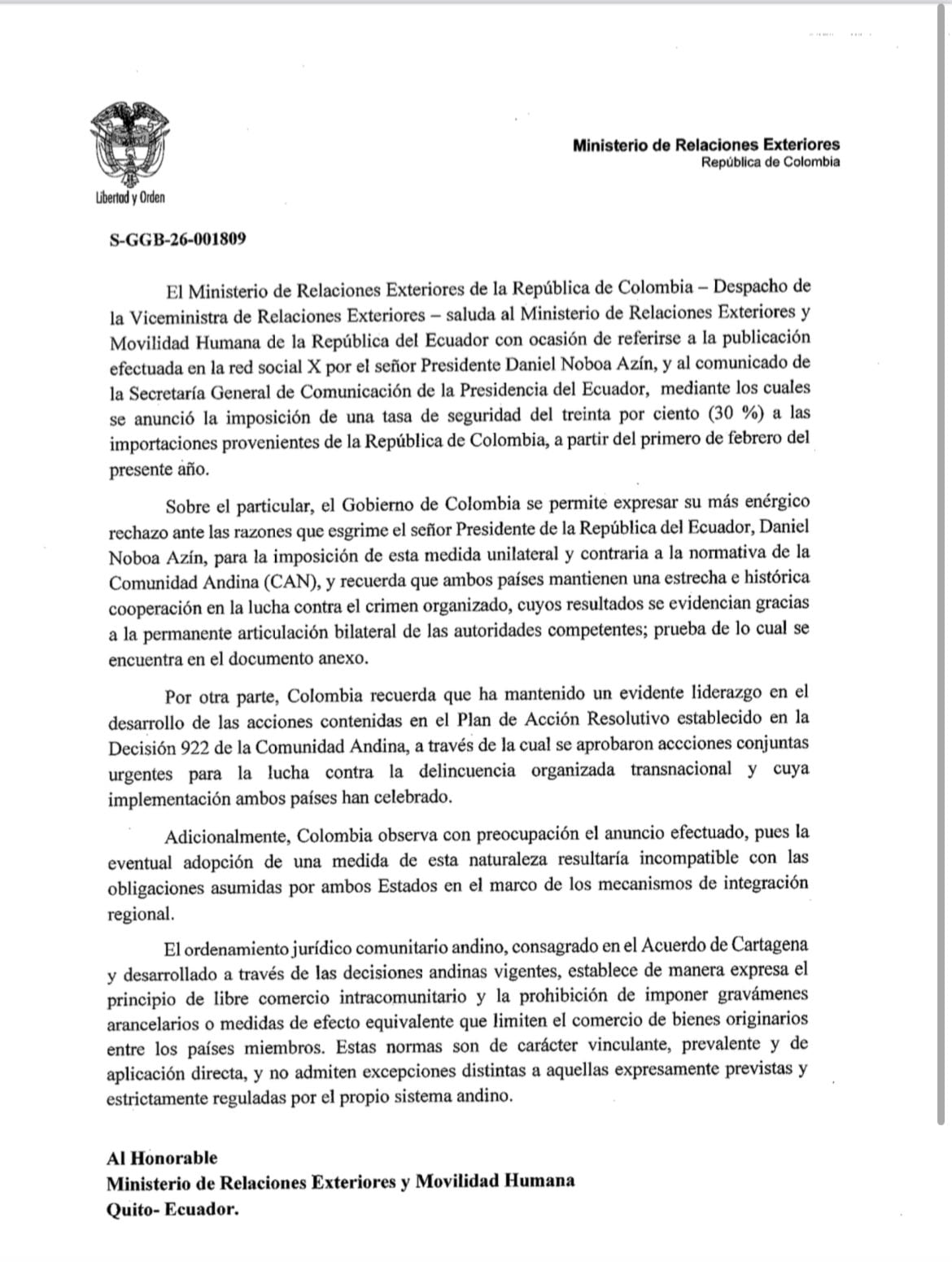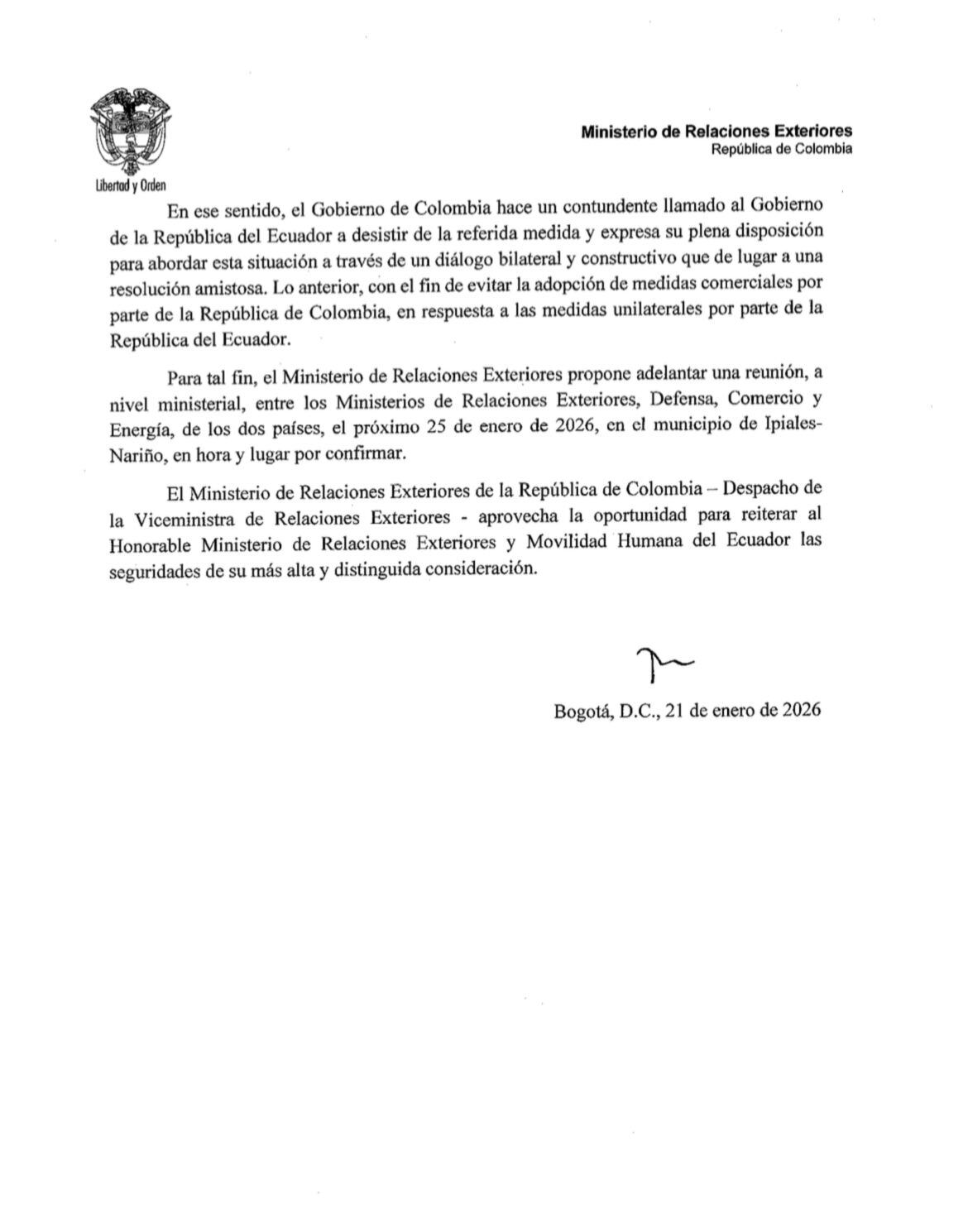 “El Gobierno de Colombia hace un contundente llamado al Gobierno de la República del Ecuador a desistir de la referida medida y expresa su plena disposición para abordar esta situación a través de un diálogo bilateral y constructivo que dé lugar a una resolución amistosa”, señala la carta.