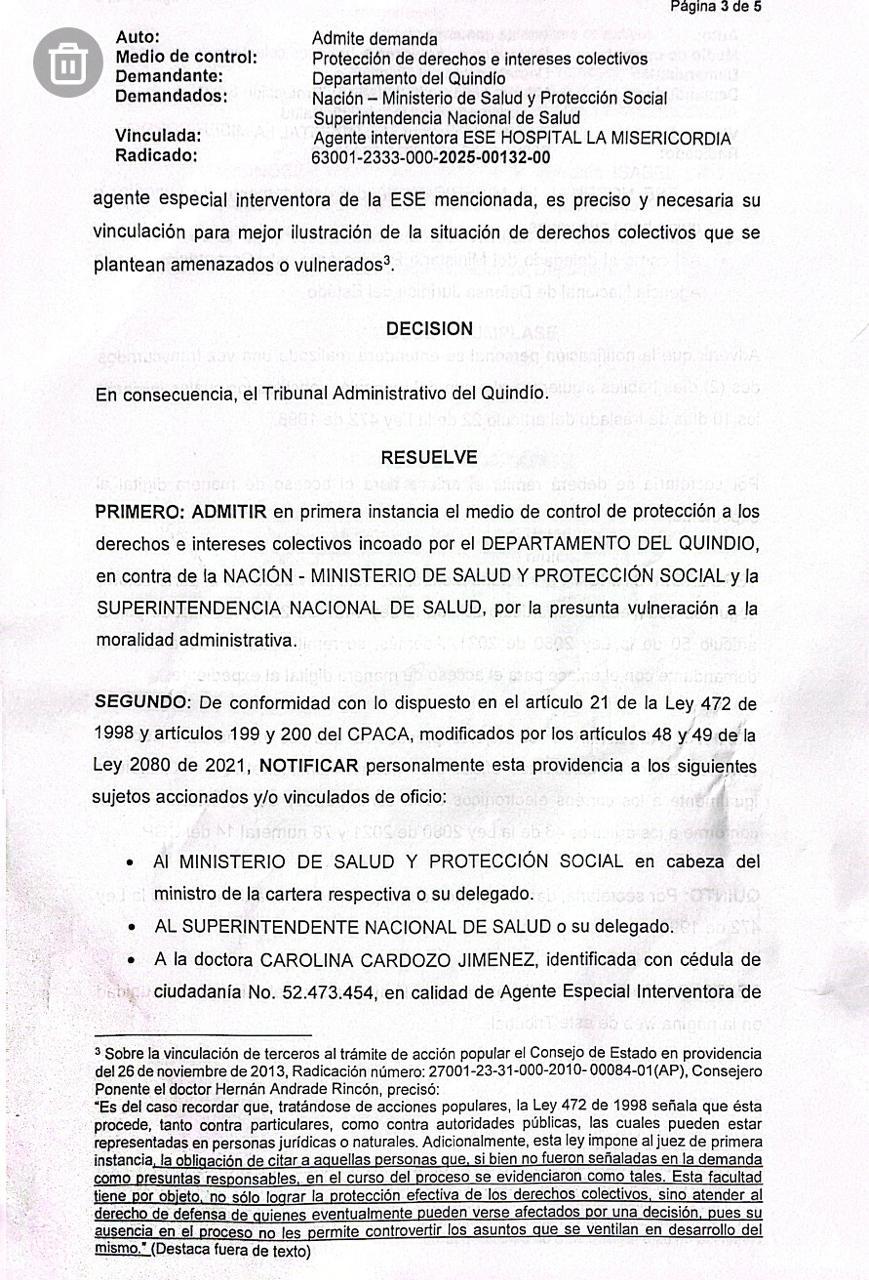 La gobernación del Quindío interpuso una acción popular en contra del Ministerio de Salud y la Superintendencia Nacional de Salud, para que concluya la intervención forzosa y se dé la devolución de la administración del Hospital La Misericordia del municipio de Calarcá.