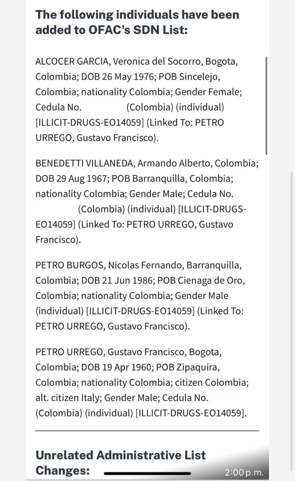 Inclusión de Gustavo Petro, Veronica Alcocer, Nicolás Petro y Armando Benedetti en la lista OFAC.