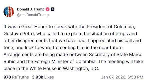Tweet de Trump acerca de la llamada con Petro en la red Truth Social.