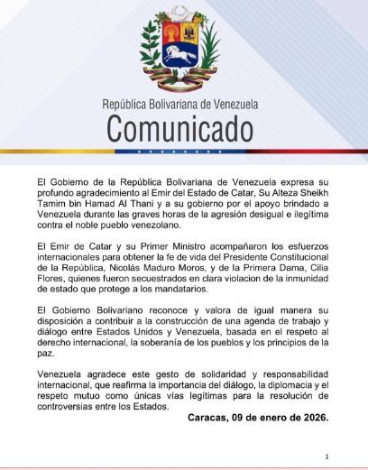 Cinco días después de la captura de Nicolás Maduro, Delcy Rodríguez expidió un comunicado agradeciendo al Emir de Catar su apoyo para obtener pruebas de supervivencia de Nicolás Maduro y Cilia Flores.
