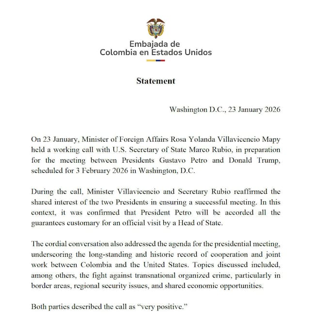 La Embajada de Colombia en Estados Unidos informó que la canciller de Colombia, Rosa Yolanda Villavicencio, mantuvo una llamada de trabajo con el secretario de Estado, Marco Rubio, como preparación para la reunión entre los presidentes Gustavo Petro y Donald Trump, prevista para el 3 de febrero en Washington.