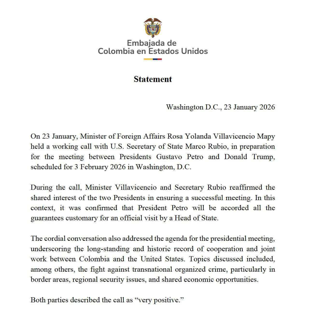 La Embajada de Colombia en Estados Unidos informó que la canciller de Colombia, Rosa Yolanda Villavicencio, mantuvo una llamada de trabajo con el secretario de Estado, Marco Rubio, como preparación para la reunión entre los presidentes Gustavo Petro y Donald Trump, prevista para el 3 de febrero en Washington.