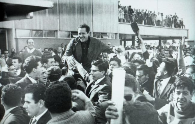 Camilo Torres Restrepo siendo alzado por una multitud durante un evento público.