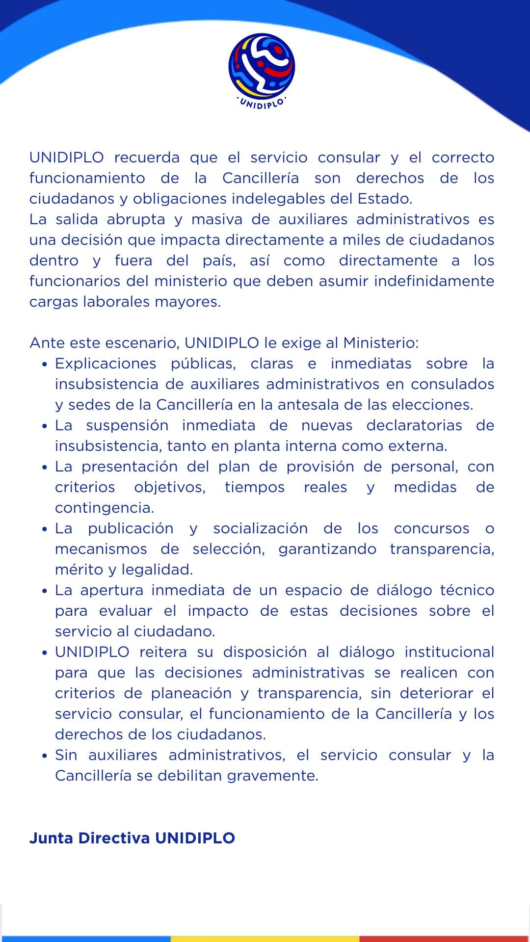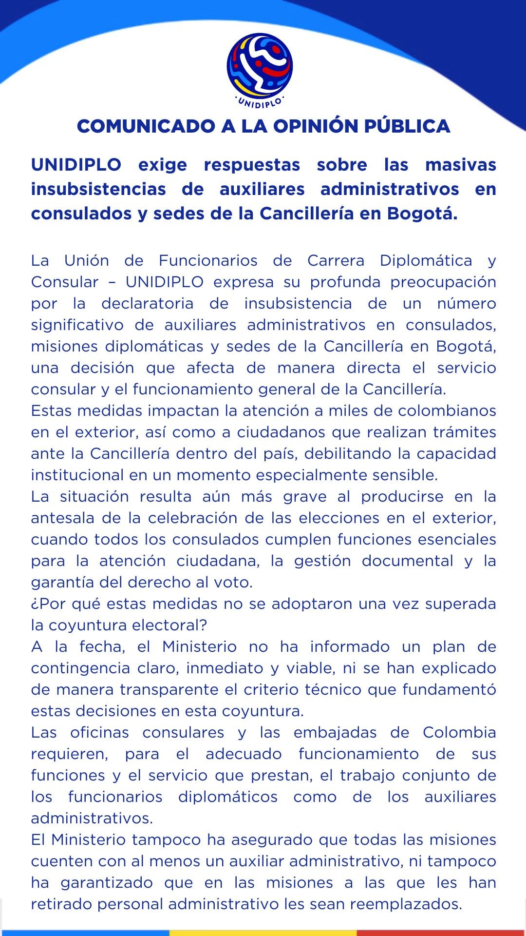Tal y como lo confirmó Caracol Radio, la Unión de Funcionarios de Carrera Diplomática y Consular, Unidiplo, se pronunció y expresó su rechazo a estos despidos masivos, pues pueden debilitar la capacidad institucional y afectar las obligaciones indelegables del Estado.