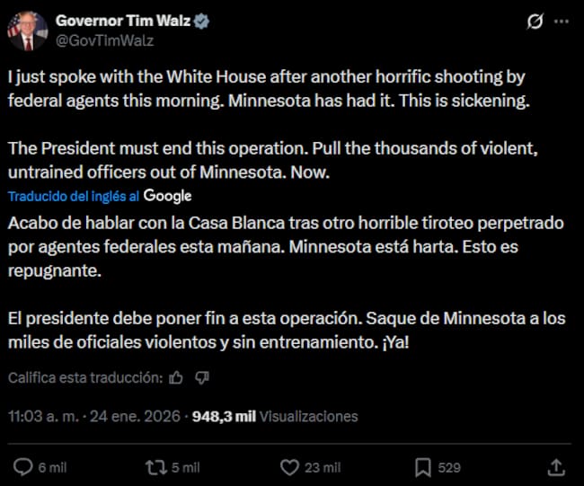 “Acabo de hablar con la Casa Blanca después de otro tiroteo atroz por parte de agentes federales esta mañana. Minnesota ya está harta. Esto es repugnante”, dijo Walz en X.